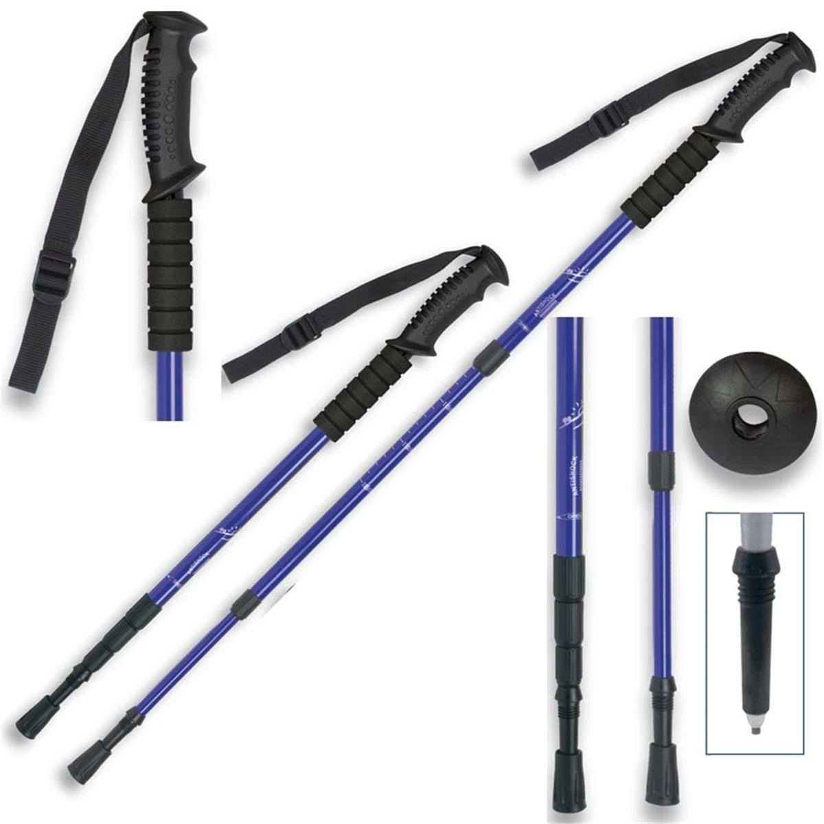 Bâton de randonnée télescopique 3 brins en aluminium finition bleu avec double poignées, pointe en tungstène et rondelle pour la neige.