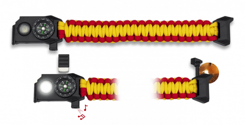Ce bracelet de survie paracorde couleur rouge et jaune d’une longueur de 24.5 cm peut vous sauver la vie, il est équipé d’un sifflet pour être localisé, d’une LED pour éclairer, d’un silex pour allumer un feu et d’une boussole pour se diriger. En cas de besoin, il suffit de le démonter pour obtenir une solide corde de 3 mètres de longueur.