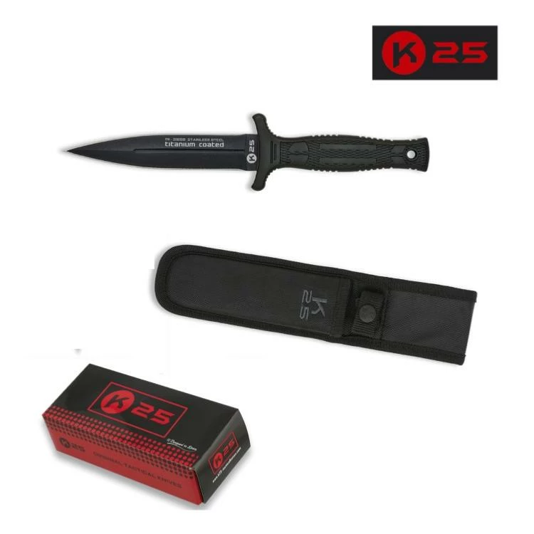 Ce couteau de botte K25 se compose d’une lame à lancer en acier inox 7Cr17Mov revêtue titane d’une longueur de 12.5 cm et d’un manche en caoutchouc noir de 10.5 cm. Vendu avec étui K25 avec clip de botte et passe ceinture.
