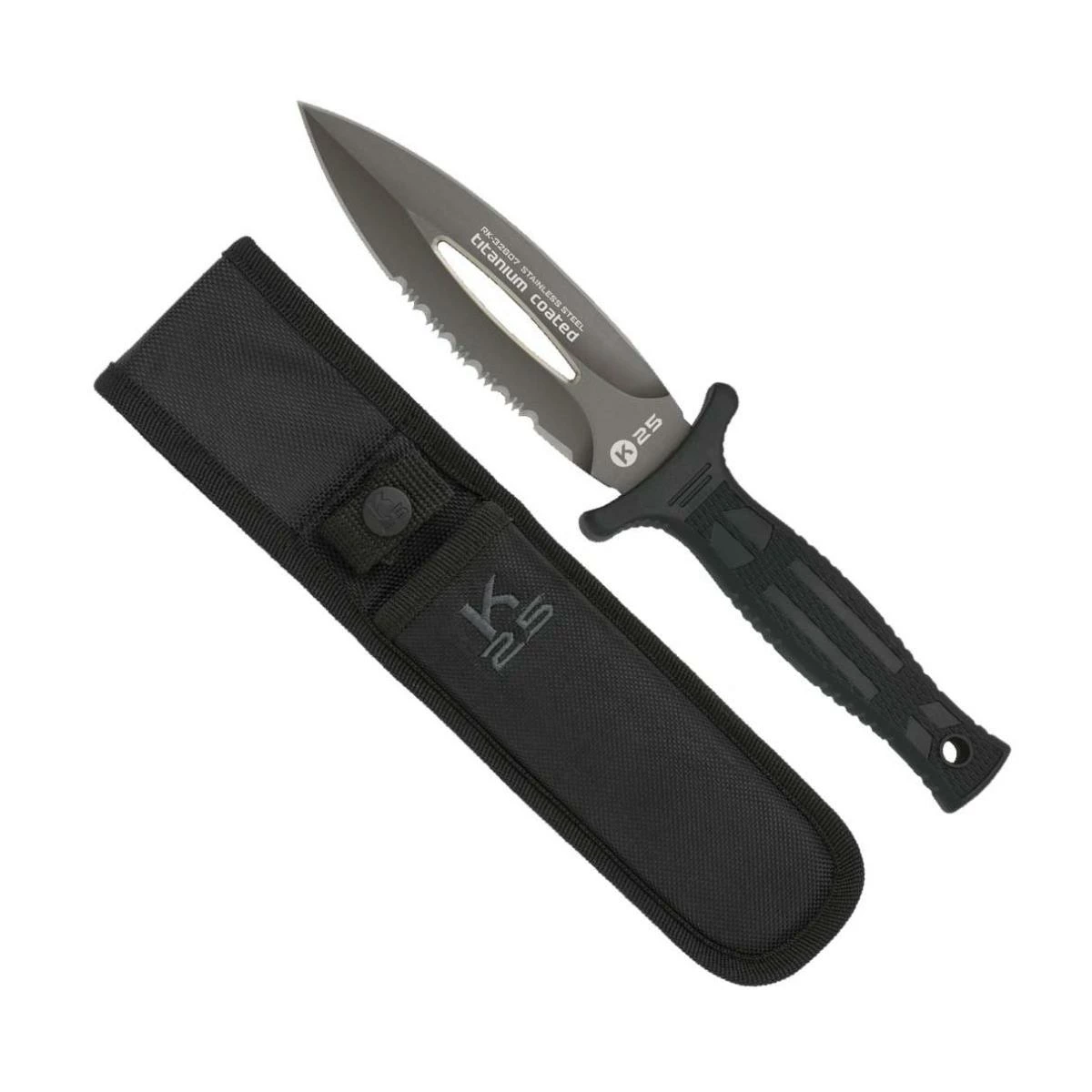 Couteau de botte K25 32607, lame ajourée double tranchant en acier 7Cr17Mov longueur 12.6 cm avec revêtement titane. Manche en caoutchouc. Etui en nylon.