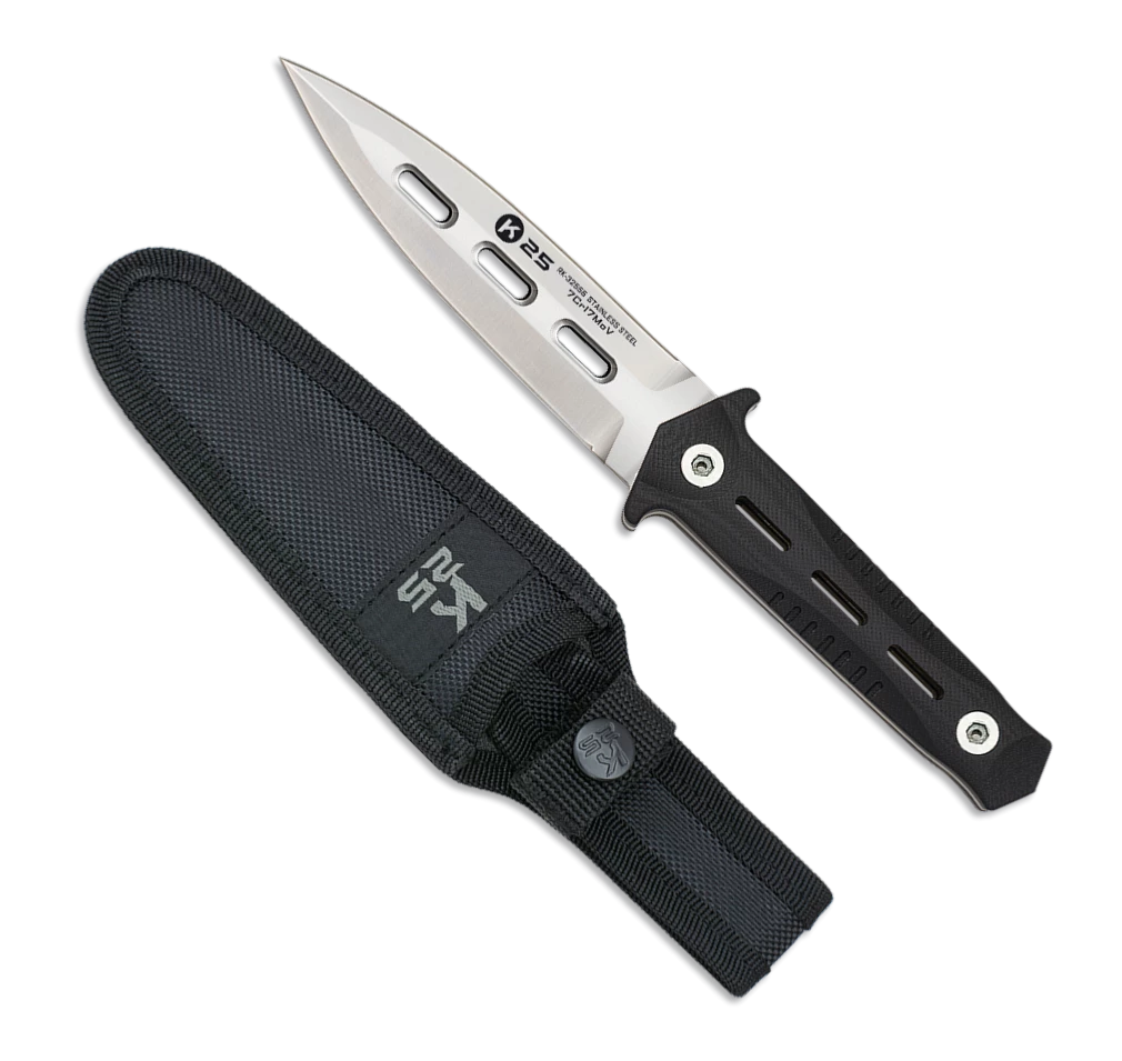 Couteau de botte K25 CNC 32556, lame pleine soie double tranchant en acier inox 7Cr17Mov finition satin longueur 12.5 cm, manche G10 noir.