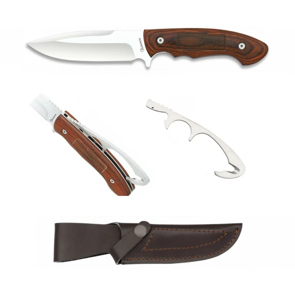 Couteau de chasse ALBAINOX 32497 : lame pleine soie en acier inox d’une longueur de 12 cm pour une épaisseur de 3.7 mm, manche en plaquettes de bois avec skinner qui se range à l’intérieur. Etui en cuir.