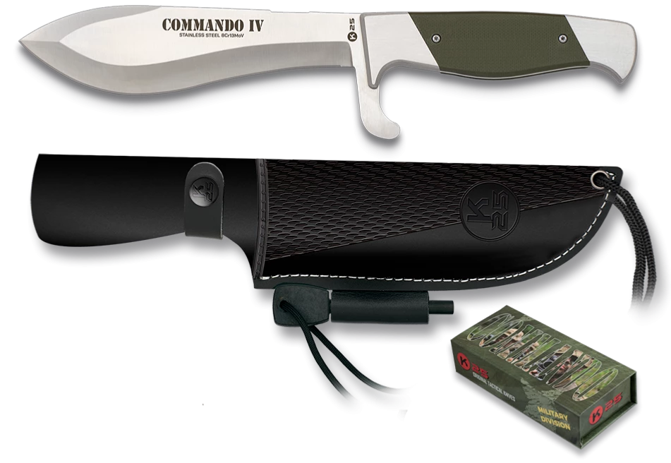 Couteau K25 COMMANDO IV 32569, lame acier 8Cr13Mov longueur 14.5 cm, manche en acier et G10 vert. Etui en cuir avec silex.