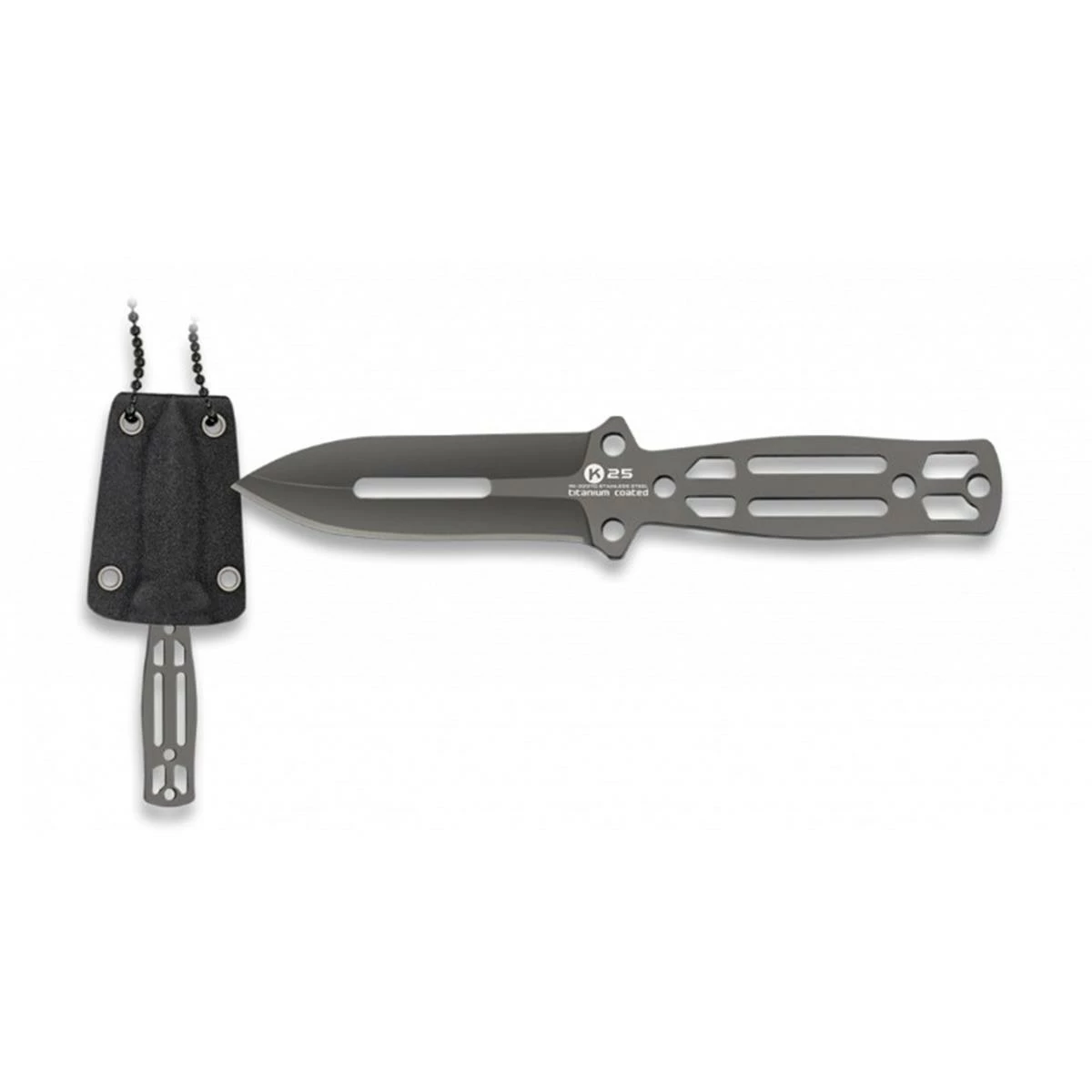 Couteau K25 kydex 32370 : manche et lame acier inox 7Cr17Mov revêtement titane. Livré avec étui kydex.
