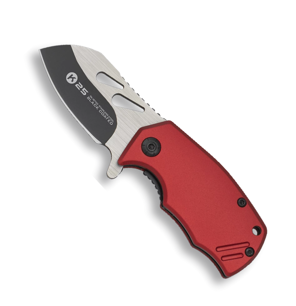 Couteau pliant tactique K25 18720, lame acier 7Cr17Mov avec revêtement titane partiel, manche en aluminium rouge. Système de verrouillage liner lock.