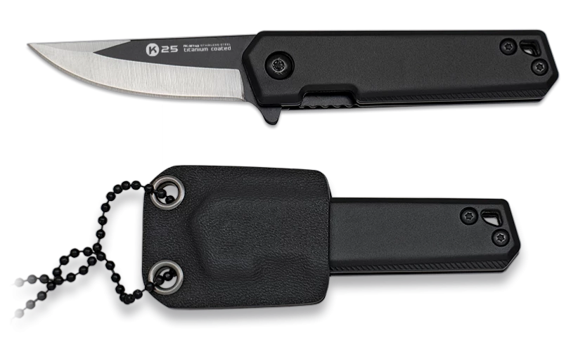 Couteau pliant Kydex K25 18743, lame en acier 7Cr17Mov finition satin et revêtue titane longueur 5.2 cm. Manche en aluminium noir. Etui kydex avec chaînette.