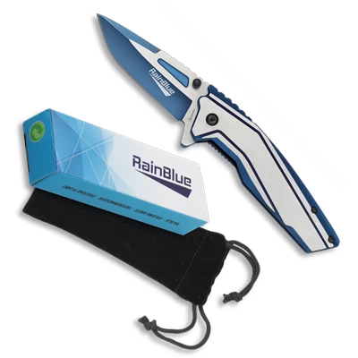 Couteau pliant automatique Rainblue 18367-A, lame en acier inox 3Cr13Mov longueur 7.3 cm et manche en acier. Système de verrouillage de la lame liner lock.