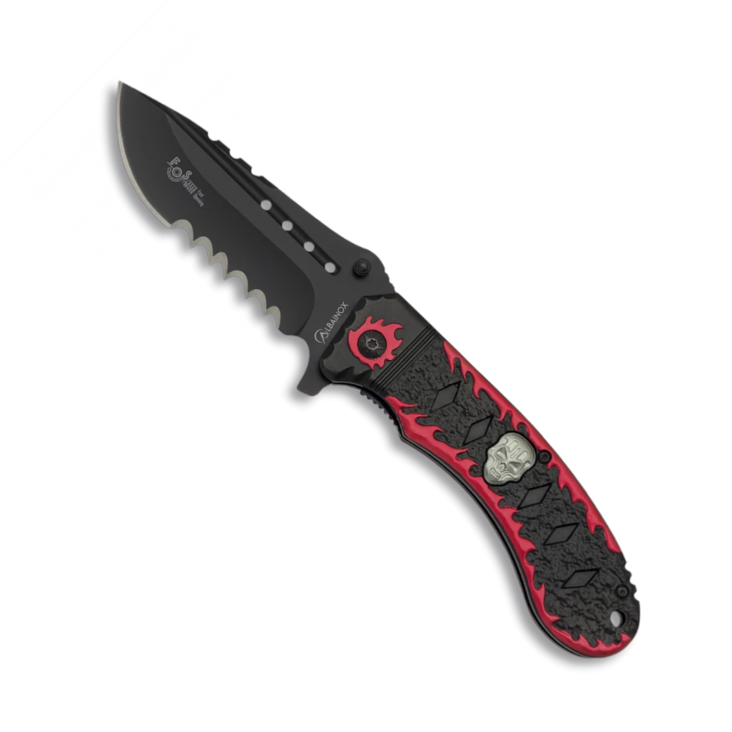Couteau pliant automatique SKULL ON FLAMES 19919-A, lame acier inox 3Cr13Mov avec scie longueur 9.3 cm, manche en aluminium rouge et noir.