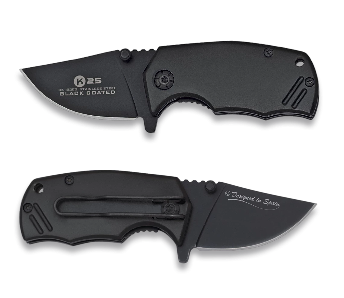 Couteau pliant tactique K25 18203, lame en acier 7Cr17Mov longueur 5.3 cm. Manche en aluminium noir avec clip.