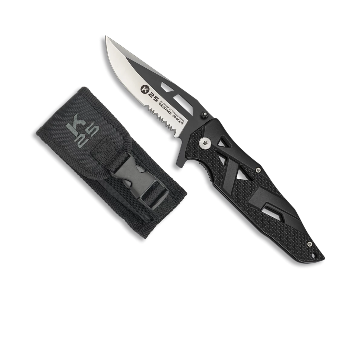 Couteau pliant tactique K25 18383 : lame longueur 8.3 cm en acier revĂŞtue titane/satin avec scie, manche ajouré en aluminium noir.