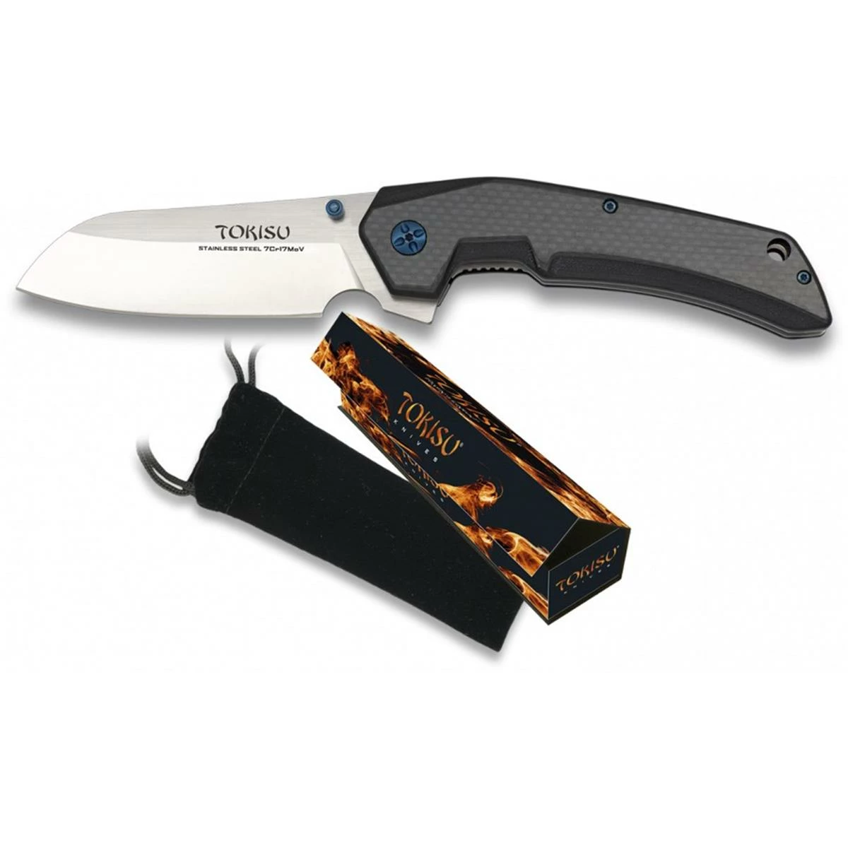 Couteau pliant TOKISU 18448 lame acier inox 7Cr17MoV longueur 9.5 cm épaisseur 3.6 mm, manche G10 et fibre de carbone. Pivot en titane avec roulement Ă billes.