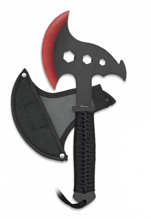 Hache Albainox 32523 acier inox finition noir et manche encordé. Longueur totale 30.5 cm. Etui en nylon.