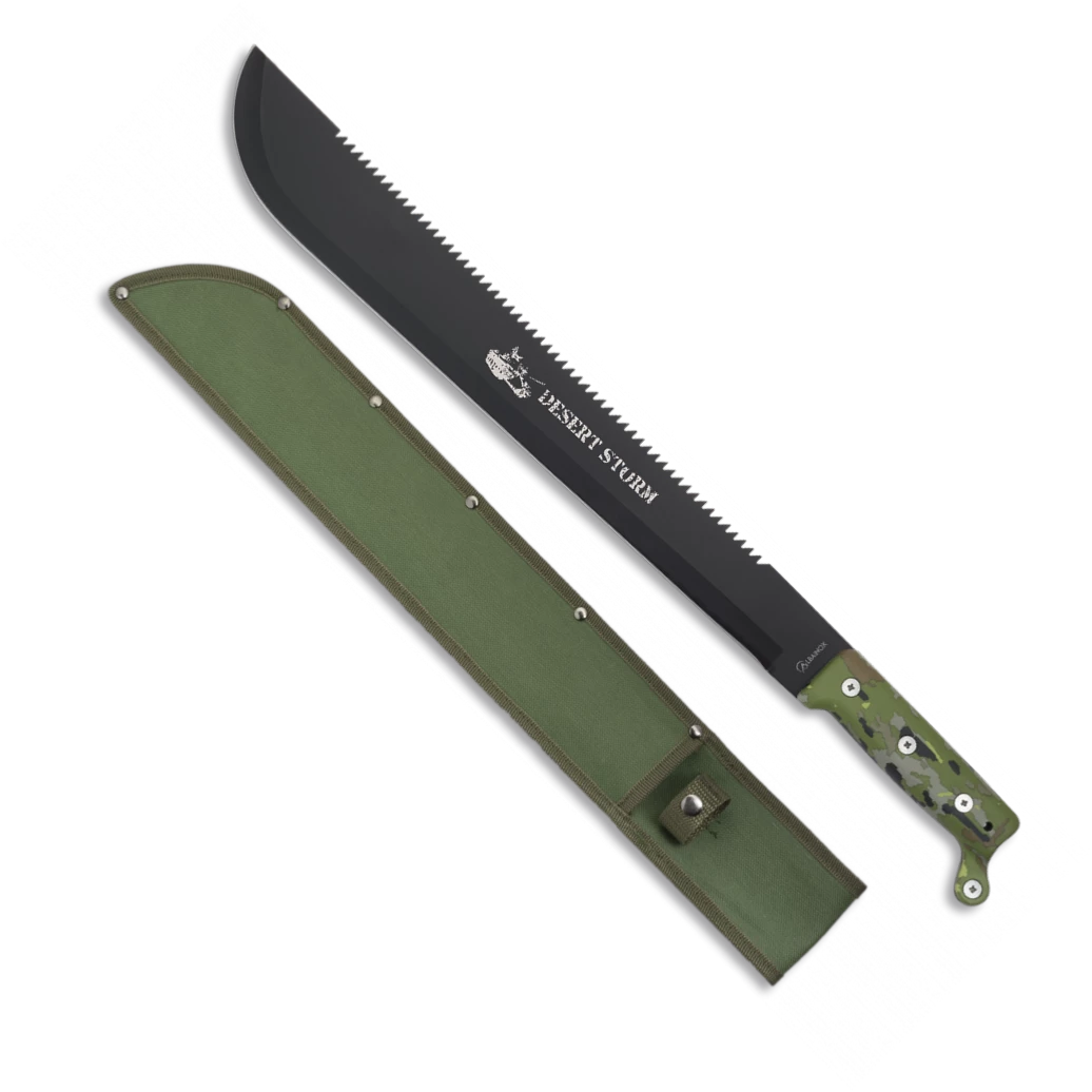 Machette DESERT STORM du fabricant Albainox avec lame pleine soie en acier inox finition noir et manche en ABS de couleur verte. Etui en nylon avec passe ceinture.