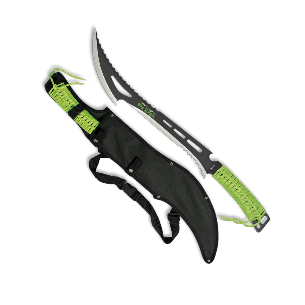 Confection fulltang en inox noir, lame polyforme alliant tranchant lisse, dents de scie et skinner, grip optimisé par l’encordement vert néon… Des caractéristiques qui, additionnées au nom évocateur de cette machette MAD ZOMBIE, confirment qu’on a affaire à un authentique zombie killer, adapté aussi bien au combat qu’à la survie. Et les caractéristiques qu’on est en droit d’attendre d’un coupe-coupe Martinez Albainox sont réunies : fonctionnalités multiples, robustesse, maniabilité et design remarquable… Étui nylon inclus.