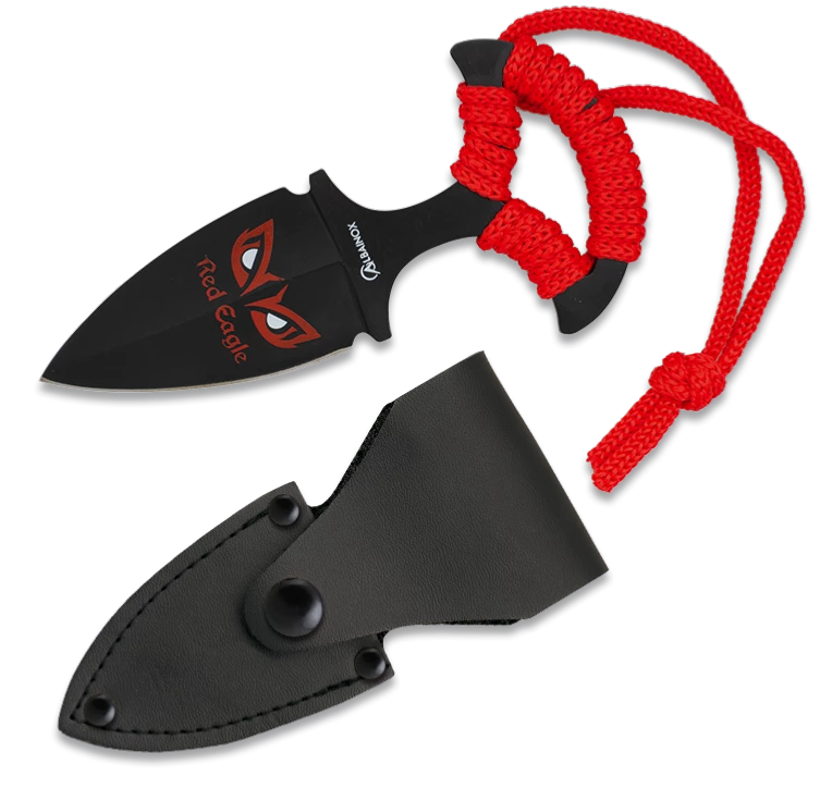 Push dagger Albainox 32606, lame inox finition noire longueur 6.5 cm avec décor RED EAGLE, manche acier encordé rouge.